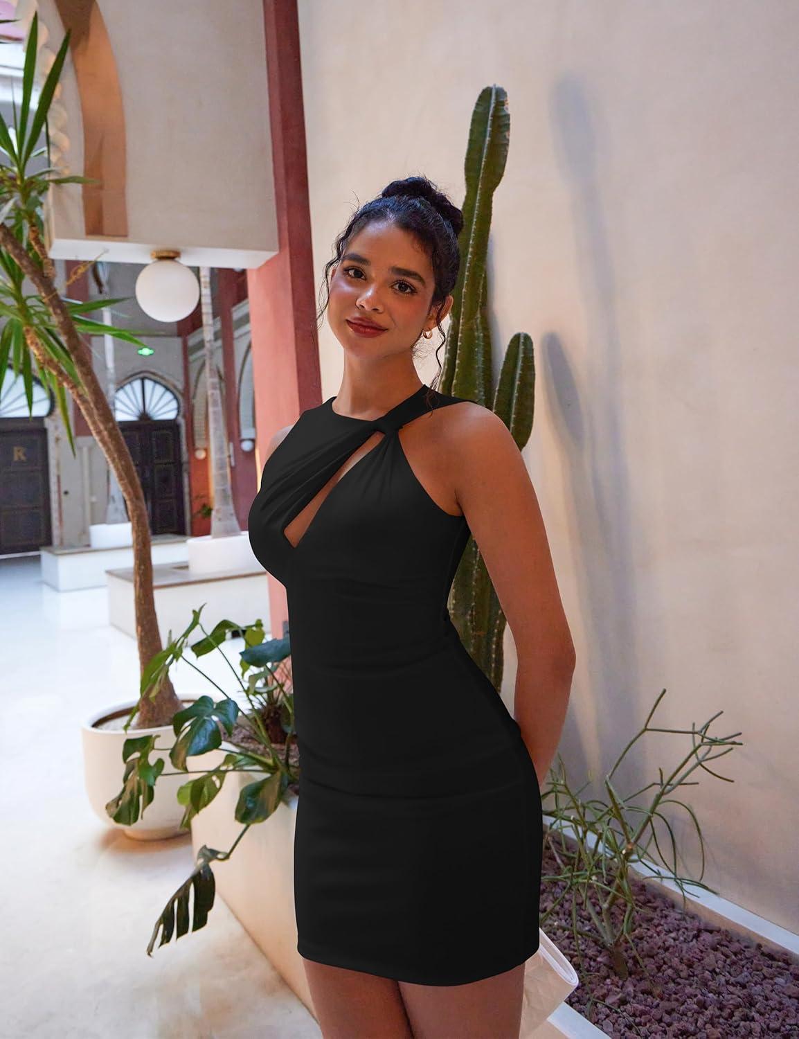 BEAGIMEG Women's Sexy Bodycon Sleeveless Asymmetric Twist Cut Out Club Party Mini Dress(Black)